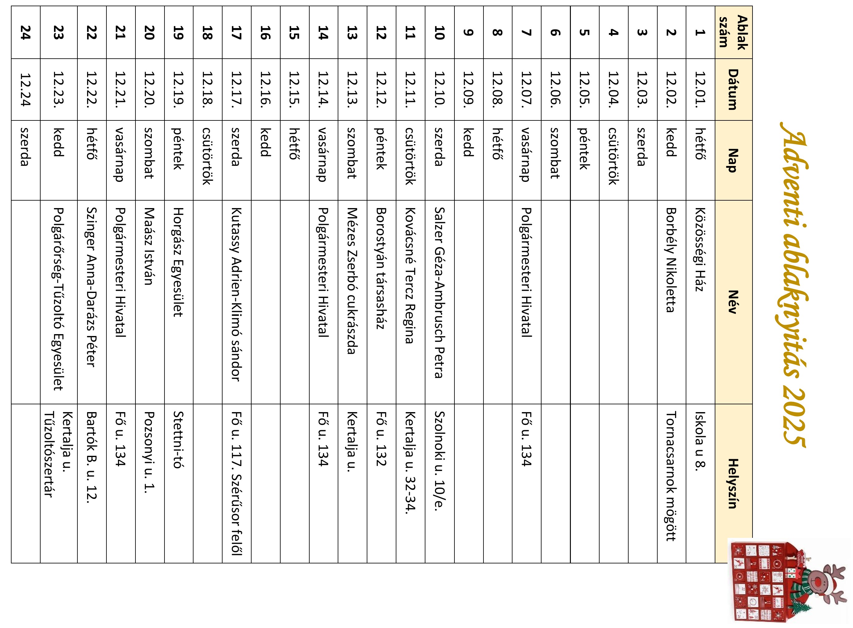 16:00 Polgármesteri adventi köszöntő, gyertyagyújtás, majd a Lőrincze Lajos Általános Iskola diákjainak műsora.