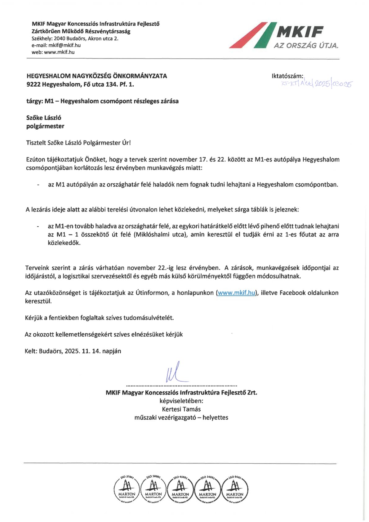 Ezúton tájékoztatjuk a tisztelt lakosságot, hogy november 17-22 között az M1 autópálya Hegyeshalom forgalmi csomópontjában korlátozás lesz érvényben munkavégzés miatt….