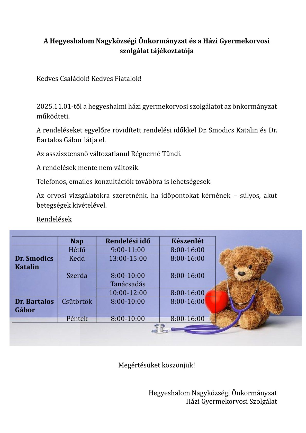 Kedves Családok! Kedves Fiatalok! 2025.11.01-től a hegyeshalmi házi gyermekorvosi szolgálatot az önkormányzat működteti. A rendeléseket egyelőre rövidített rendelési időkkel Dr. Smodics Katalin és Dr. Bartalos Gábor látja el.... Bővebben, klikk a képre! |